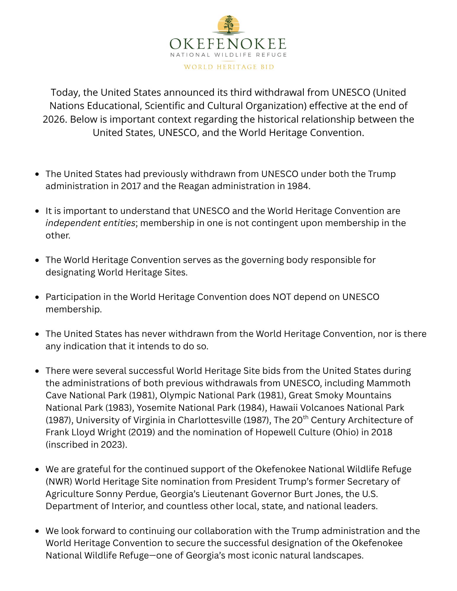 The Okefenokee National Wildlife Refuge and the Civil Rights Trail are expected to be nominated by the National Park Service (NPS) for inclusion on the UNESCO World Heritage List. This is a long process and one that requires a broad community of supporters. Fortunately, membership in UNESCO is not required for sites to be designated as World Heritage Sites. The Okefenokee National Wildlife Refuge has developed talking points on the withdrawal. I am attaching them below for anyone meeting with their congressional representatives this month so you are prepared to urge them to continue to these two bids as well as the NPS team that manages the effort.